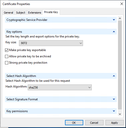 - under 'Key options' set the 'Key size:' to at least '3072', choose 'Make private key exportable'